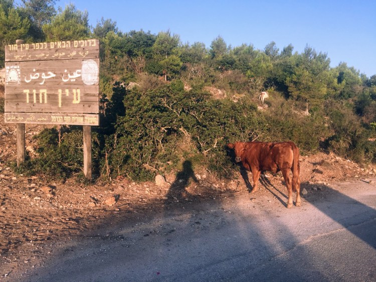 Just this morning I ventured south of Haifa to a little Town called Ein Hod. Josh and I fell in love with this town a few days ago but I wanted to explore the area more on two wheels. Stay posted, I will certainly share our experience of this charming artist colony. Anyways, just past this town you enter into the Carmel National park where the trees become even more luscious, the road gets small, and you see fewer cars but way more cows. The ocean was below me, and just ahead were fields and fields of forest with the sun rising above. Charlie and I followed the road as it got bumpier, curvier, and steeper to a small little town called Eyn Hawd. A different but similar named town to the Ein Hod we had visited earlier. It seems common that towns have very similar names, but it also seems even more common that they are very liberal with English spelling. Some times you will see Mount Carmel and others you will see Karmel. It may be confusing but keeps things exciting I guess. At one point the grade was 20%. This is definitely the steepest I have ridden before. I say “ridden” but I most definitely had to get off and walk. Yes, I know, embarrassing, but I did make it down. The town was about the size of a football field, surrounded by pomegranate trees, lemon trees, and orange trees getting ready for winter, overlooking the mediterranean sea and Mount Carmel. It of course had some hummus shops that were added to my list.