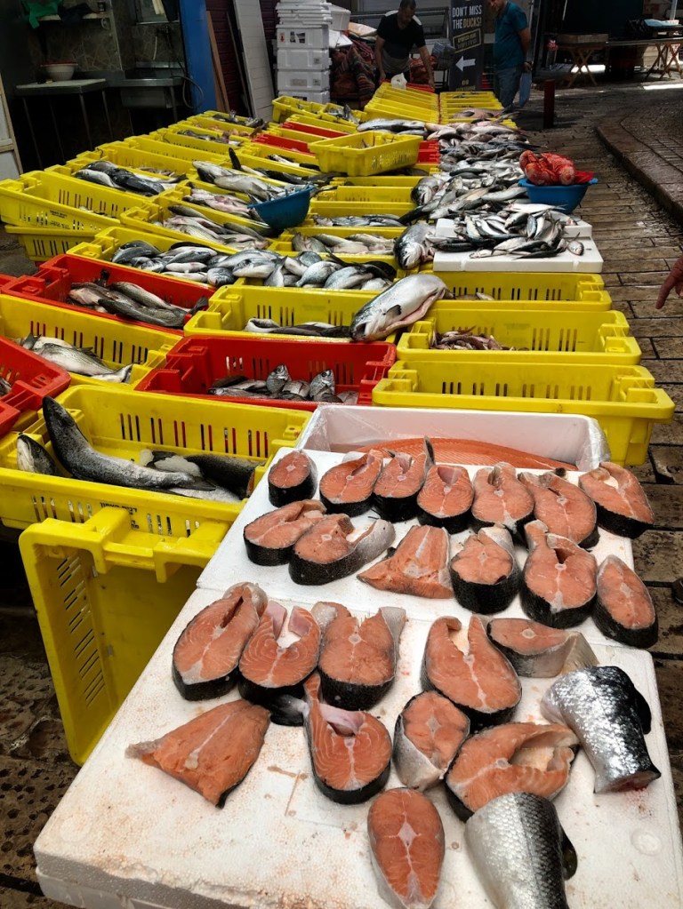 Each market is complete with a few butcher shops and fish stands. The only things I recognize include salmon, shrimp, and octopus. Everything else looks so foreign and there are only hebrew labels to further my confusion. We purchased salmon, not only because it is a favorite of ours, but also because it was the only one we didn’t have to scale ourselves. With an adventurous attitude we decided we should also try something a bit out of our ordinary. we decided on a piece of white fish that didn’t look too intimidating. I still am not certain what we got, maybe a tilapia or a rock fish. Whatever it was, it tasted fresh and delicious. It might be a good idea to learn some hebrew fish names so that we can feel a little more prepared when we step up to the fish market stall.