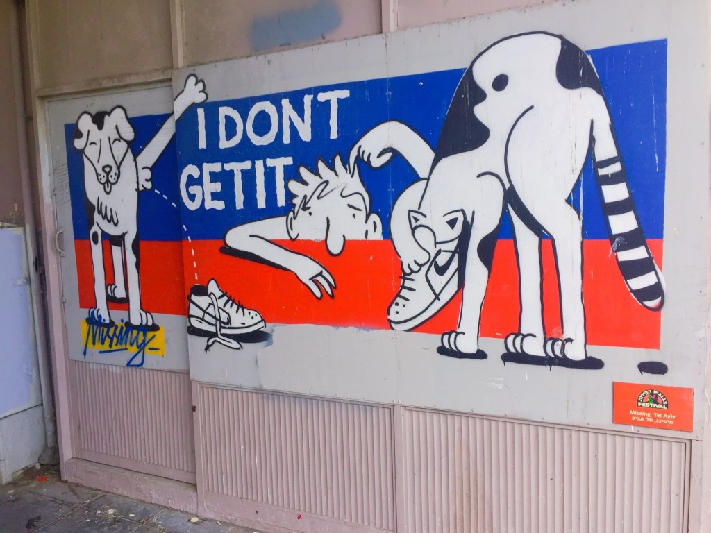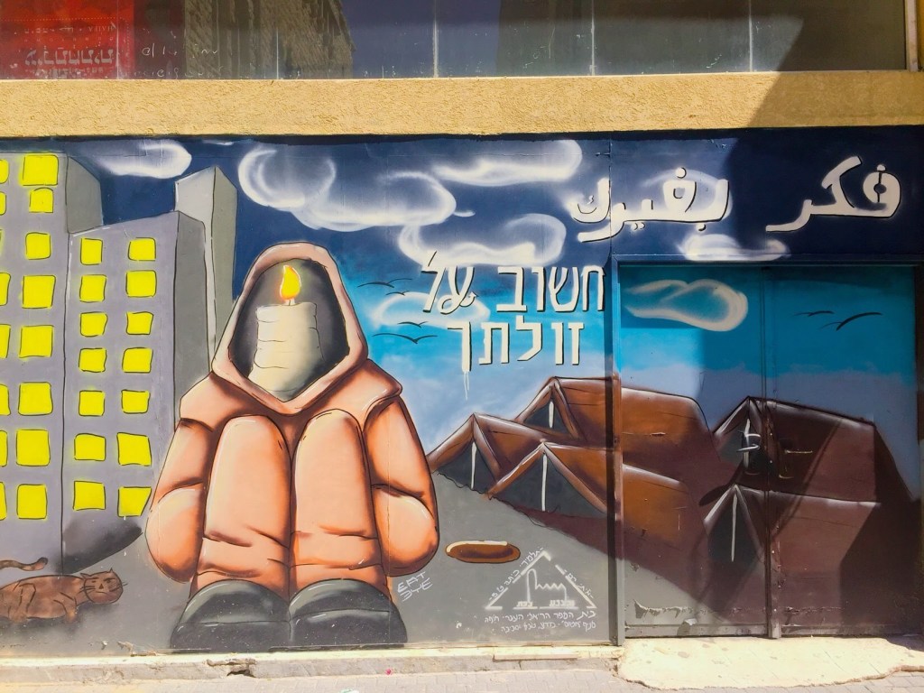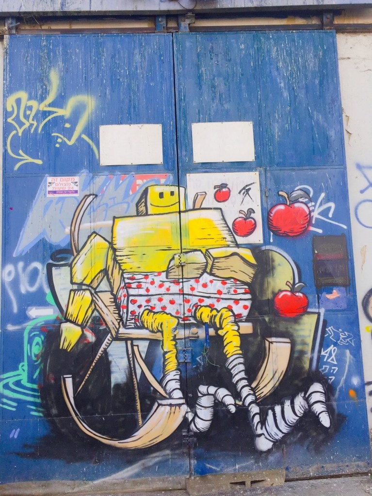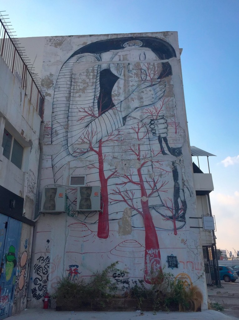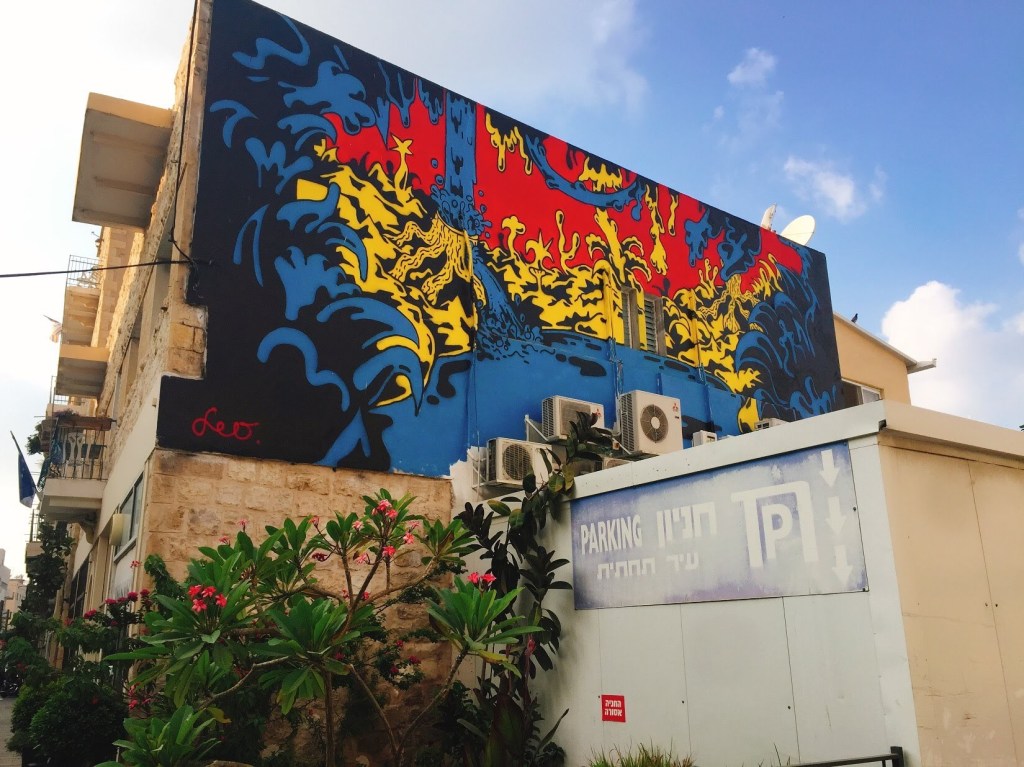 My best discoveries often come from my excursions with Charlie. Wrong turns, desperate need for bathroom breaks, and avoidance of busy streets lead me to some of the most amazing sights in Israel. While on a ride a few weeks ago, I was led to an incredible mural that covered the entire wall of a building. Located in the heart of downtown Haifa, a very average building was plastered with an incredibly vibrant and massive piece of art. I was immediately amazed by the sheer size and the extensive detail that went into the piece. As I continued to casually spin through the area, I kept coming across other incredible murals. Some big, some a bit smaller, but all igniting conversation about contemporary topics in society.